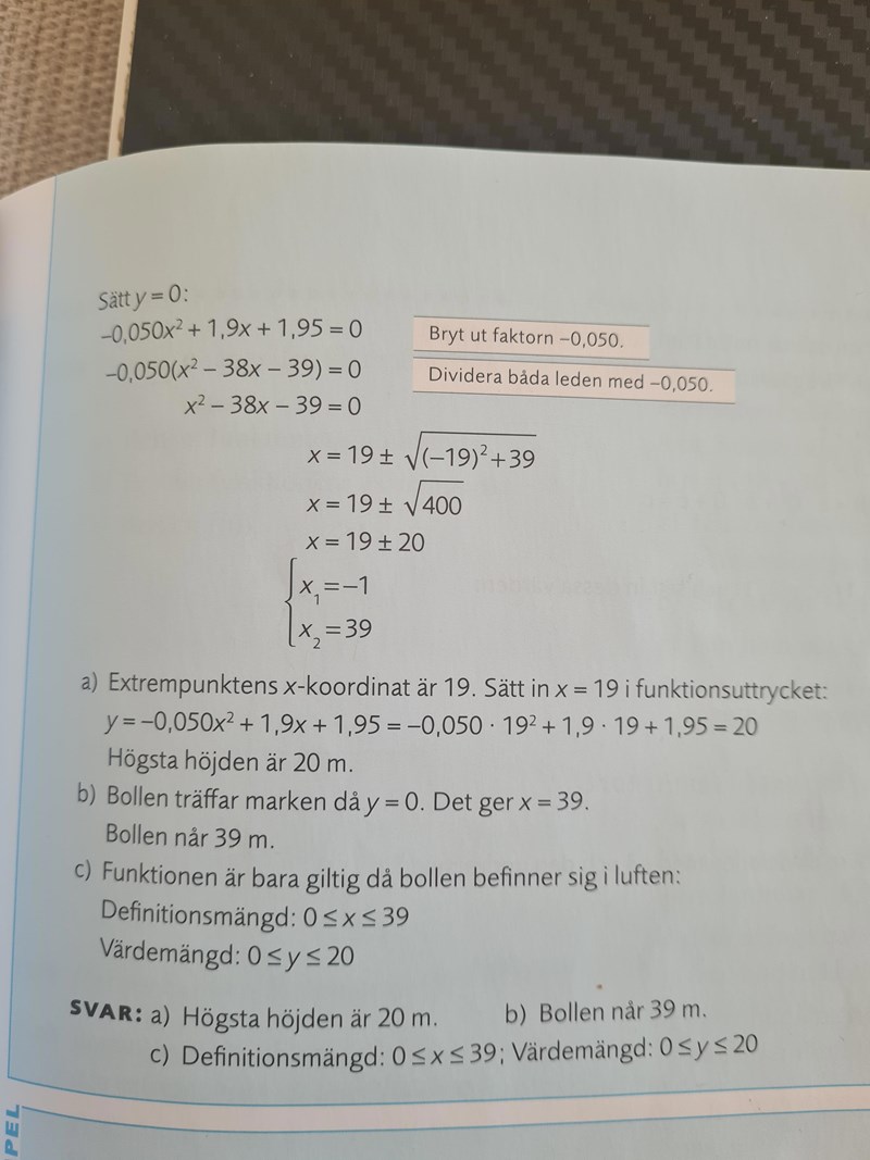 Jag läser ett exempel ur matteboken där man ska lösa funktionen y = -0,050x^2 + 1,9x + 1,95.