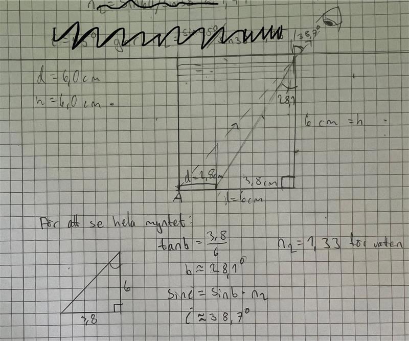 Ja, vinkeln 45 grader. och då fås brytningsvinkeln 32,1.. vilket är större än 28,1 grader vilket är vad brytningsvinkeln minst måste vara för att se hela myntet?