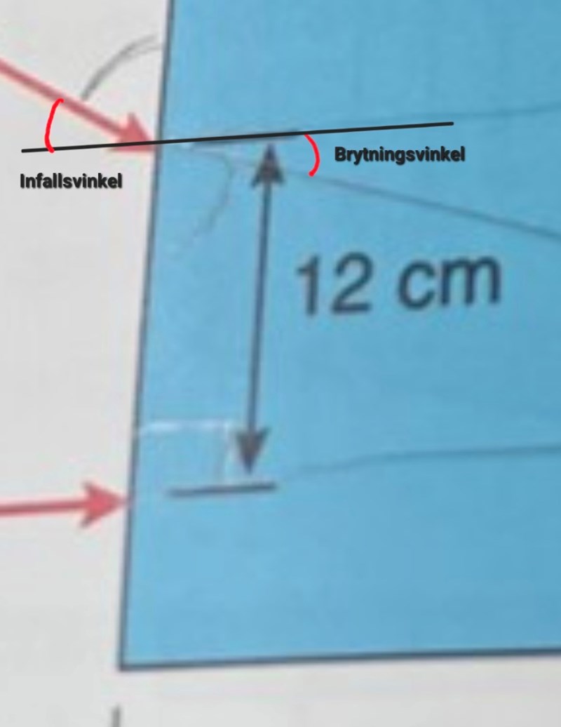 Se bild, det är de rödmarkerade vinklarna är infalls- respektive brytningsvinkel.