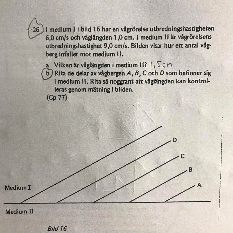 Vågbergen fortsätter på andra sidan skiljelinjen på ungefär samma sätt, men nu är det 1,5 cm mellan dem. Ser du hur det kan vara det? Tänk på bara A och B först.