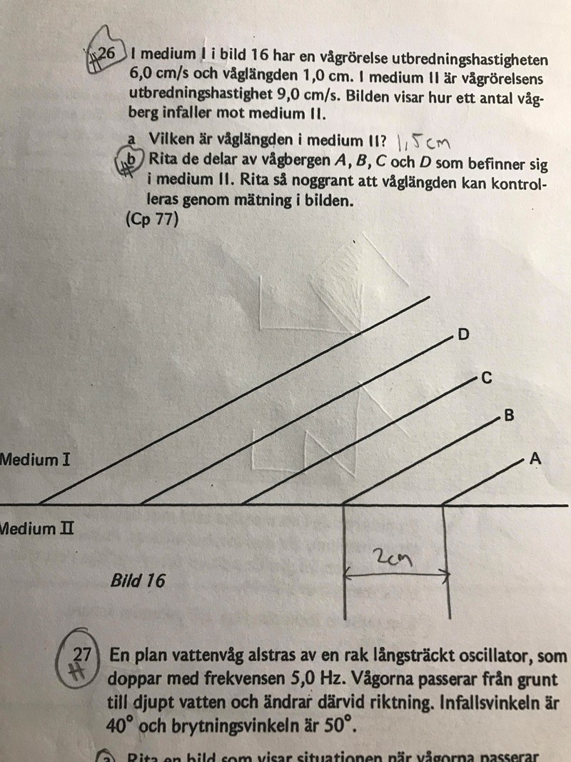 Bra. Det är uppenbart för mycket, för det skulle vara 1,5cm. Kan du rita linjerna en smula snett så att avståndet blir 1,5 cm? Du kan använda trigonometri för att ta reda på rätt vinkel i stället för att prova dig fram.