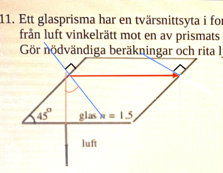 Strålvägen (de röda linjerna) är dock korrekt. Om du ritat normalerna korrekt kommer du kunna räkna ut själv varför det stämmer. Du ser att strålen går ut hur prismat parallellt med hur den gick in. Det är detta de mena i facit.