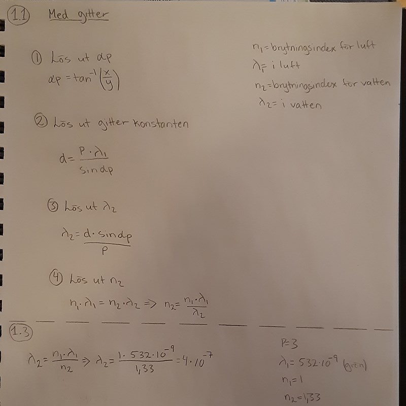 Ni behöver väl en till mätning? Om jag tolkar saken rätt gör ni först en mätning (av vinkeln) i luft för att bestämma gitterkonstanten, vilket går för att ni vet våglängden. Sedan behövs väl en mätning av vinkeln i vatten, när ni vet gitterkonstanten men inte våglängden. Då kan ni använda vattenvinkeln för att räkna ut våglängden i vatten. Men ni använder samma vinkel hela vägen, så det ni har räknat ut i steg 3 är våglängden i luft.