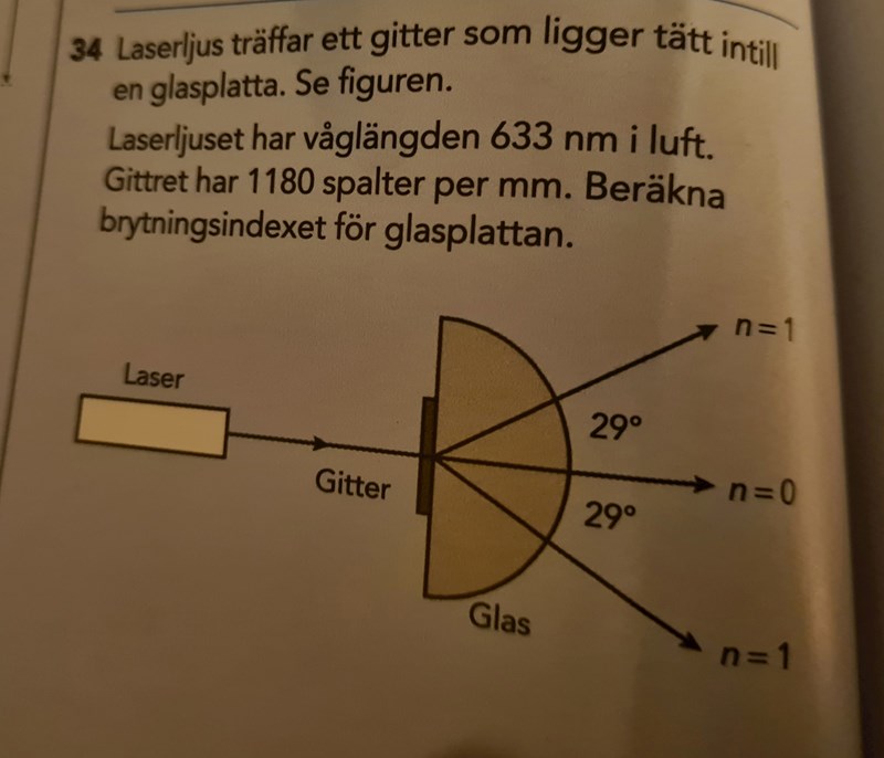 Sedan ska du utnyttja att definitionen av brytningsindex i ett medium är förhållandet mellan ljushastigheten i vaccum (eller luft) och ljushastigheten i mediet, vilket blir samma förhållande som mellan våglängderna i luft respektive i mediet.