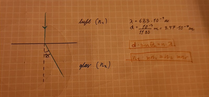 Du ska använda gitterformeln för att beräkna laservåglängden i glasplattan, precis som du trodde.