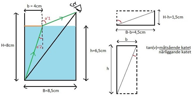 Eftersom pinnen i det här fallet ser ut att vara "böjd uppåt" mätte jag till synes längden "b" sett från uppifrån längsmed pinnen. Efter det mätte jag höjden på glaset(H), vattennivån(h) samt bredden(B). Sedan räknade jag ut vinklarna genom att rita trianglar och använda tangens med de kända sidorna. Jag fick:
