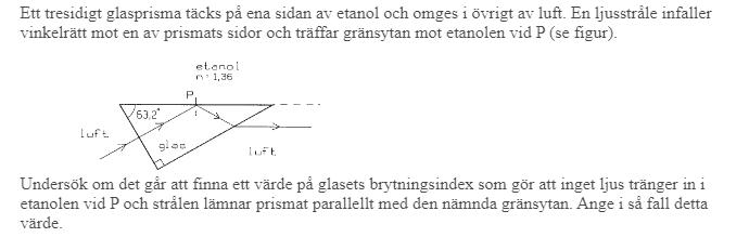 Vänsterledet i ekvationen för totalreflektion är gränsvinkeln vinkeln där totalreflektion börjar uppstå. Det du vet är att vinkeln måste vara större än så för att du ska få totalreflektion. Vad vinkeln faktiskt är har du från figuren, så du kommer få en olikhet där du kan lösa ut brytningsindexet. Sen kommer du också få en ekvation för brytningen till höger, där du vill att utgående stråle ska vara parallell med gränsytan mot etanolet.