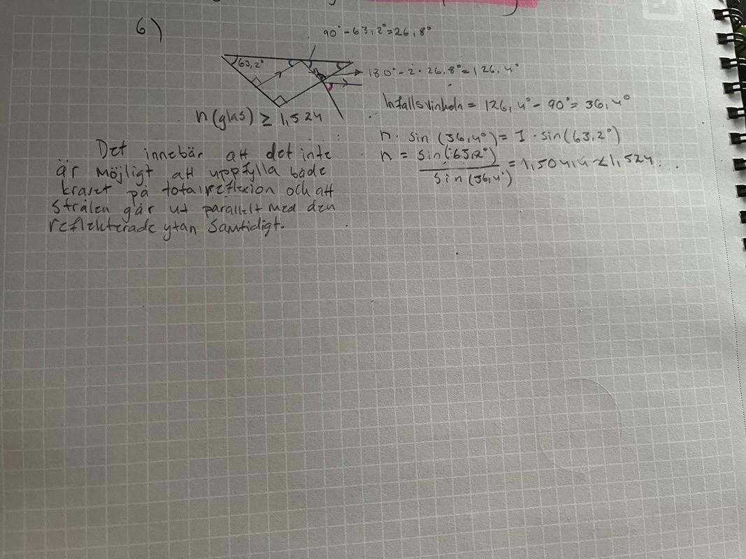 Hej kan ni hjälpa mig genom att titta om jag har gjort rätt eftersom jag inte har ett facit på detta, frågan lyder ”Ett tresidigt glasprisma täcks pà ena sidan av etanol och omges i övrigt av