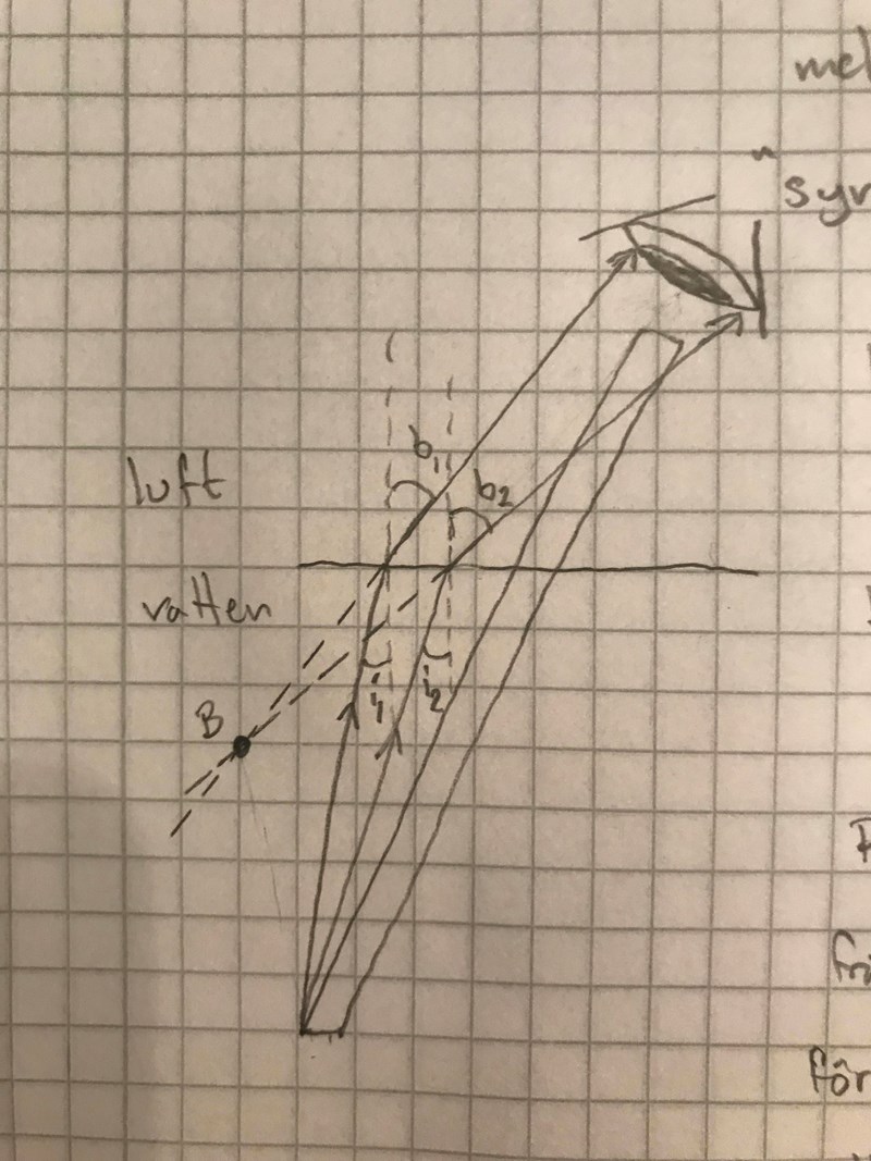 Här har jag ritat ut två strålar från pennans nedre ände och visar hur de bryts, på ett ungefär, och att pennans ände därför ser ut att finnas i punkten B.
