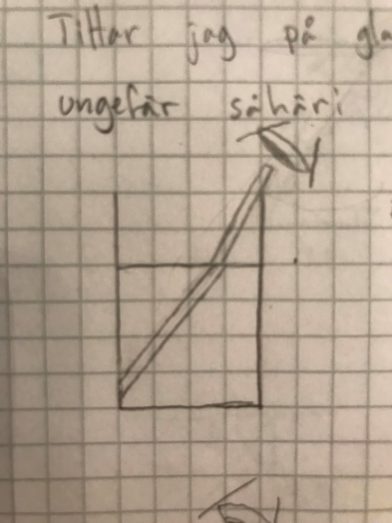 Jag tycker det finns två sätt att arbeta här: 1) titta på glaset från sidan med ett rutat papper bakom och rita en bild där du får med var de två ändarna av pennan är under vattenytan, och över vattenytan, samt de andra måtten (bredden, höjden och hur högt vattnet står). 2) titta längs pennan uppifrån med ett rutat papper under glaset och rita en bild med var pennans nedre ända verkar vara, och de andra måtten.