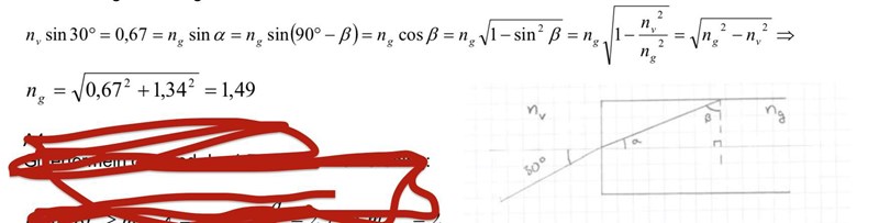 Hej! I ett lösningsförslag från en gammal tenta finns det ett samband som gör mig lite förvirrad. Jag är med på att man utgår ifrån brytningslagen osv och hänger med enda fram till trigonometriska ettan. Det jag inte riktigt är med på är hur blir