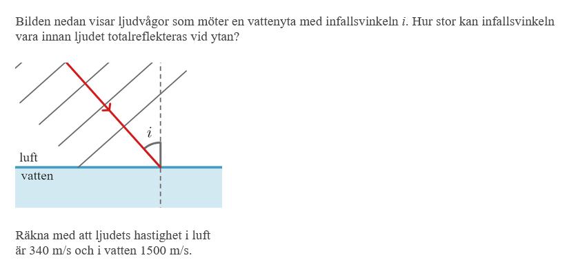 För att det står att det handlar om totalreflektion. Om ljuset kommer in snedare än en viss vinkel, så kan det inte brytas. Om ljuset kommer in med brytningsvinkeln 12o bryts det till 85o (påhittade siffror). Om ljuset kommer in med 12,5o bryts det till 89o (fortfarande påhittade värden). När vinkeln är sådan att brytningsvinkeln skulle ha blivit 90o eller större så går det inte, utan allt reflekteras.