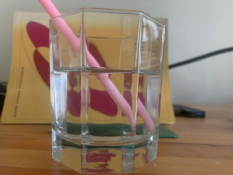 Ta fram ett glas, helst rakt och fyll det med vatten. Lägg i en penna som städjer mot kanten, dvs som står snett. Gör nödvändiga mätningar och bestäm vattnets brytningsindex.