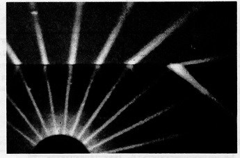 En ljuskälla finns på botten av en vätskefylld behållare av glas. De ljusknippen som utsänds från ljuskällan träffar vätskeytan. Figuren visar ett fotografi av försöksuppställningen. Bestäm vätskans brytningsindex genom mätning i figuren. Den del av figuren som används för mätningen skall ritas av och utförda mätningar redovisas.