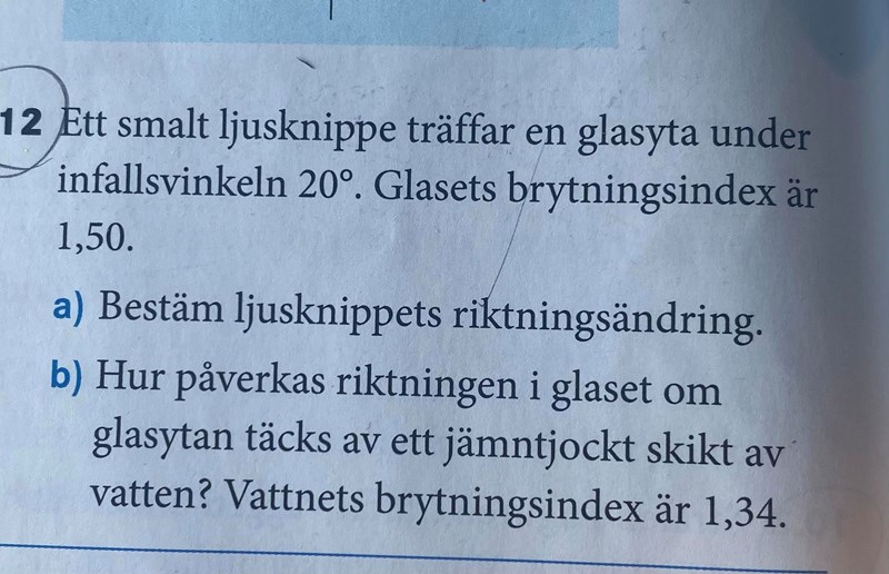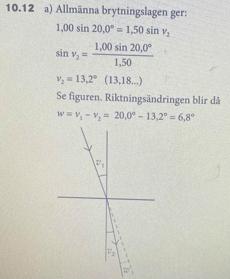 Jag har fastnat på denna, förstår inte riktigt vad som menas med riktningsändring och varför man beräknar den i denna uppgift, i tidigare problem har man inte beräknat den och utgått från att vinkeln som man får av n1 sin i = n2 sin b är samma som brytningsvinkeln, blir tacksam för förklaring!