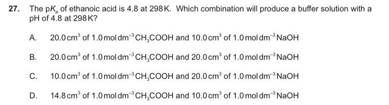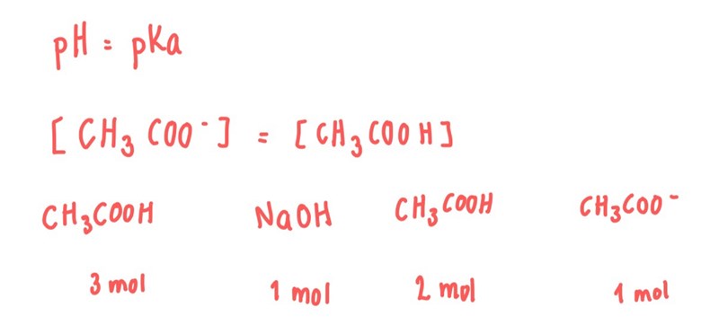 Observera att pH=pKa. Om du tittar på buffertformeln innebär det att koncentrationerna av basen (etanoatjoner) och syran (etansyra) är lika höga. Eftersom NaOH är en stark bas kommer 1 mol etansyra att ge 1 mol etanoatjoner om den reagerar med 1 mol NaOH.