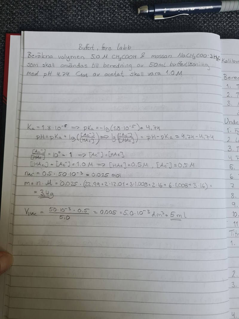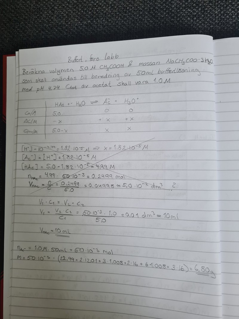 Jag har en labb under veckan som handlar om buffertar. Innan labben ska vi beräkna volymen 5M ättiksyra och massan fast natriumacetat som skall användas i labben. Så här gjorde jag men nått känns fel. Kan någon kolla igenom och se vad som ska ändras.