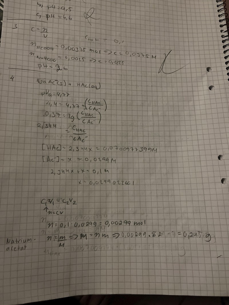 Då har du bestämt x, alltså koncentrationen natriumacetat. Du vet också att volymen är 100 cm3 så du kan bestämma substansmängden och därefter massan via molmassan för natriumacetat.