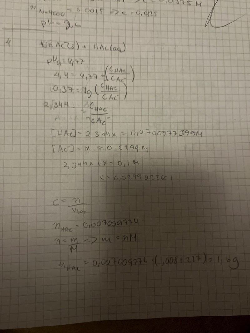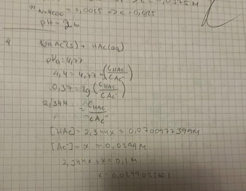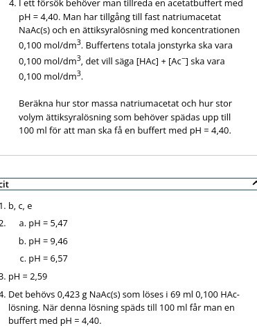 Det innebär att koncentrationerna av ättiksyra och acetatjoner tillsammans ska bli 0,100 mol/dm3. Börja dock med buffertformeln och försök lösa ut kvoten c(syra)/c(bas) efter att du har satt in pH och pKa.