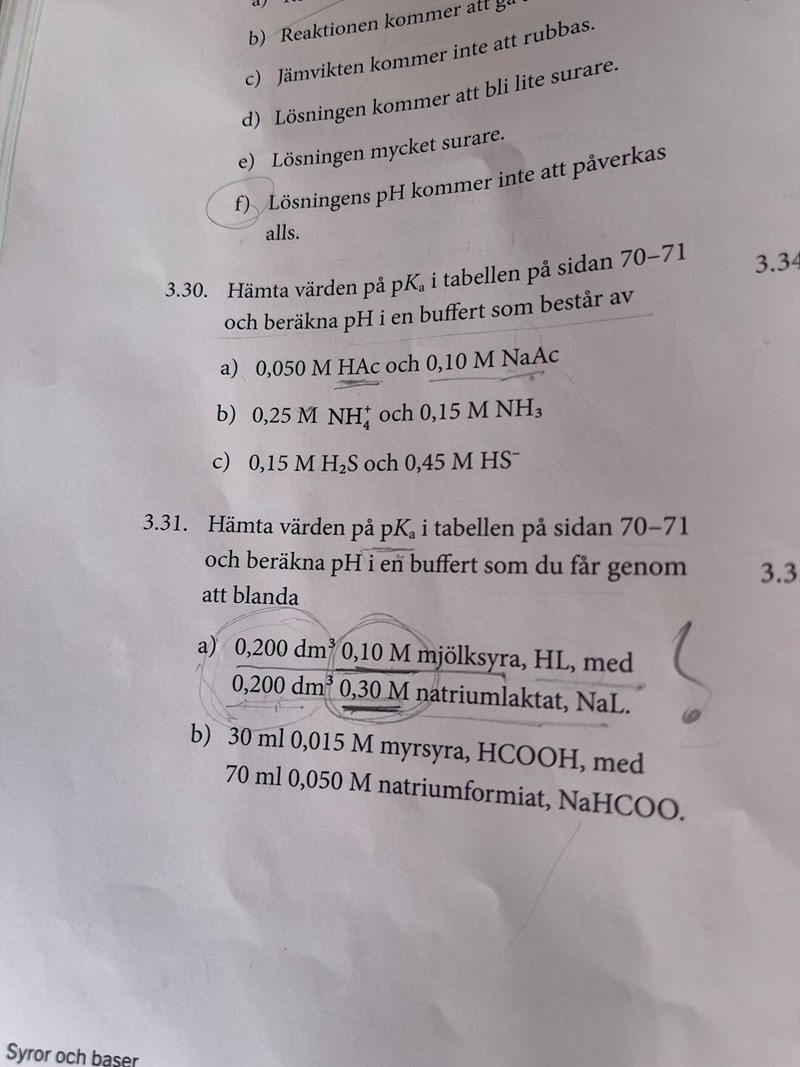 Lyckades du lösa uppgift 3.30? De här är nästan likadana, du måste bara räkna ut koncentrationen av syran och den korresponderande basen i lösningen först.