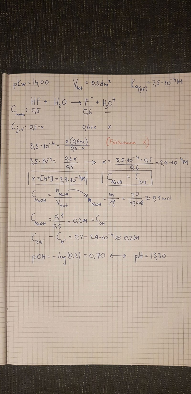 En buffertlösning består av 0,50 M HF och 0,60 M NaF. Till 500 ml av denna lösning tillsätts 4,0 g NaOH (volymen påverkas ej). Beräkna pH i bufferten efter tillsatsen av NaOH. pKw = 14,00.