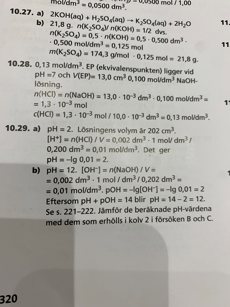 jag har räknat ut dom. Jag har en fråga på a) skulle man först räkna ut substansmängden för att kunna stoppa in i formeln c=n/V och dela med volym. Då skulle man bara ta den volymen av vattnet inte addera HCls volym och dividera. Men på b för att ta reda på antal OH- skulle man addera volymen av båda vatten och ämnet och när man räknat substansmängden ta dividerat med den totala volymen? Varför gör man på olika sätt i a och b?