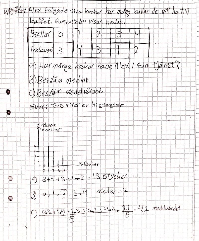 Du menar att 10 av de 13 personer har tagit bullar och bullar är 10 stycken?? då det blir 21/10= 2,1 medelvärdet??