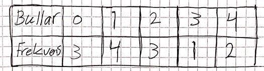 Laguna skrev:Freedom skrev:JoakimRL skrev:Medianvärder är inte korrekt. Det får man genom att "ställa" alla personer på en rad. Längst till vänster 3 pers som tog 0 st bullar, därefter 4 st som valde 1, osv. Den mittersta personens val av bullar (av totalt 13 pers) ger medianvärdet på antal bullar.