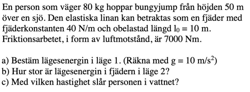 Hej! Jag har framför allt problem med c) frågan. Jag vet att ifall personen i fritt fall utan lina hade nått maxhastighet men hur räknar jag då bort lägesenergin i bungyjump linan plus luftmotståndet? ingen i skolan som har förklarat hur man kalkylerar med luftmotstånd.