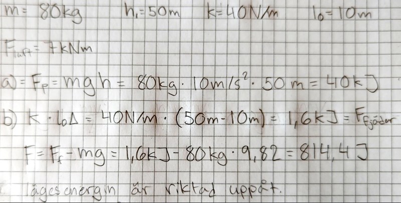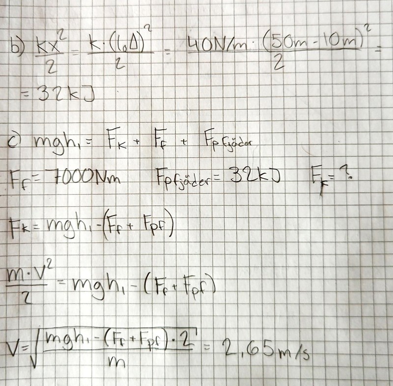 Okej så i b) har man löst den potensiella energin i fjädern, jag har friktionsarbete som luftmotstånd och rörelseenergin fattas. Ska jag bara räkna ihop friktionsarbete * Potensiell energi i fjäder = rörelseenergi då?