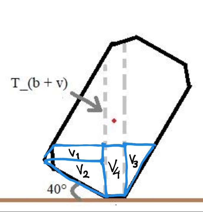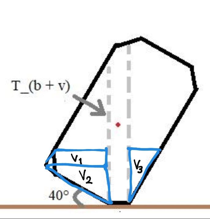 Tyngdpunktens normal för burken och vätskan måste ju ligga innanför de streckade linjerna, så att den faller inom stödytan. Detta borde i sin tur ge ett intervall för volymen som man kan fylla burken med för att den ska kunna balansera.