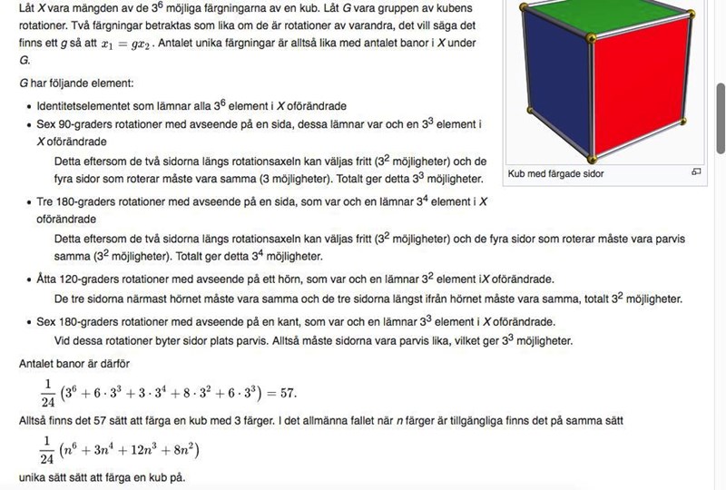 Laguna skrev:Det står inte åt vilket håll de vill rotera 90 grader, men vi säger medurs. Om du har en sida vänd mot dig och vrider den 90 grader medurs och låter resten av kuben följa med, så har du gjort en av de sex rotationer som de menar under den punkten. Det finns sex sidor, så det finns sex sätt att göra en sådan rotation.