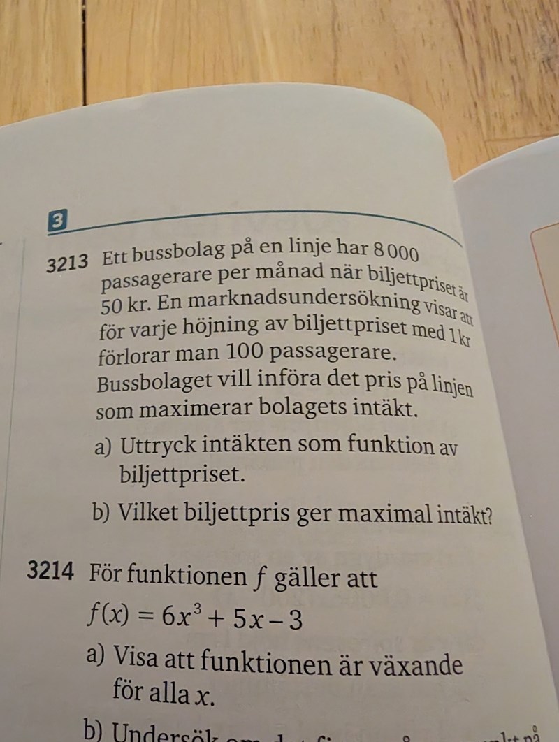 Har inget att visa. Jag måste skriva ett uttryck för intäkten som beror på priset. Jag kan inte tänka ut det. Man förlorar också 100 passagerare per höjning 1 krona så alltså måste man balansera ut dom på något sätt.