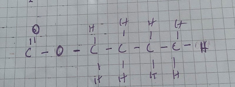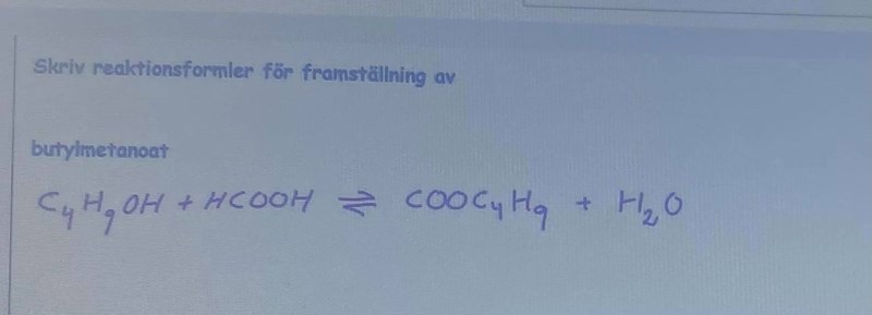 Tänkte också på det, men förstår då inte hur den stämmer överens med reaktionsformeln. Den har ju 5 kol sammanlagt i reaktionsformeln, men om jag skriver dit ett kol blir det inte fel då eftersom jag får sammanlagt 6 kol i bilden ovan