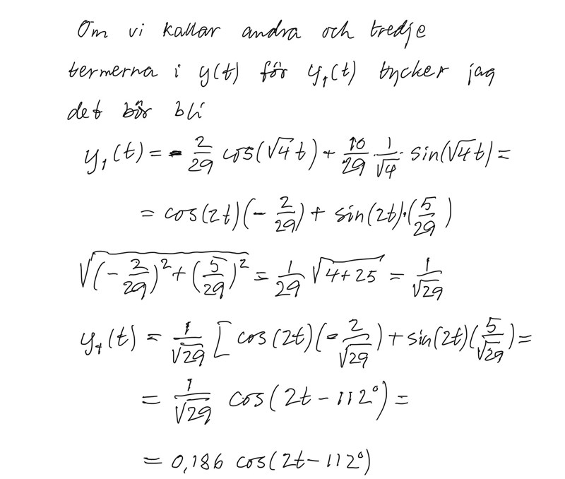 Facit ger; y(t) = 0.0069t + 0.186cos(2t - 118)