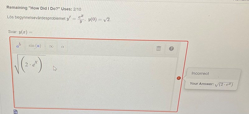 och sedan ange sqrt(2)*exp(x/2) i svarsfältet. Om det inte heller accepteras, så får du höra av dig till den kursansvarige för att rapportera in en bugg. (Och om det accepteras, så borde du faktiskt också rapportera in buggen)