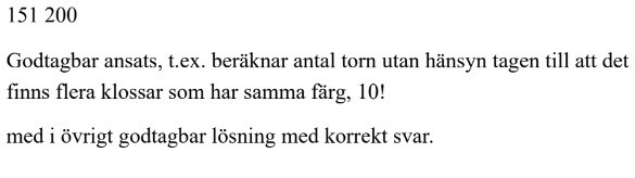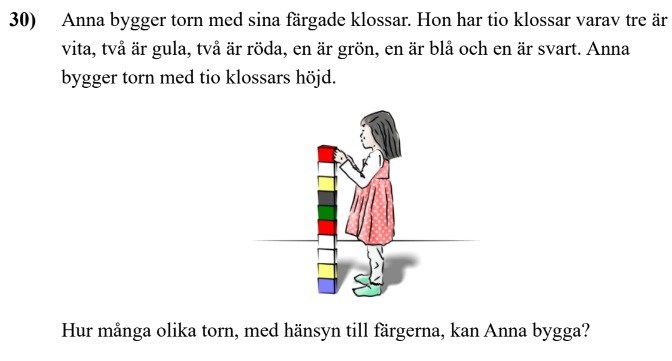 Tänk dig att du har tio positioner i tornet. Först bestämmer du var de tre vita ska vara. På hur många sätt kan du göra det? Jo på sätt, eftersom du ska välja ut tre positioner för de vita klossarna av de tio möjliga. Sedan har du sju positioner kvar, och då skall du placera in de två gula. Du har sätt. Sedan blir det för de röda. De sista har unik färg, och de placerar du på 3! sätt. Multiplicera ihop allt för svar!