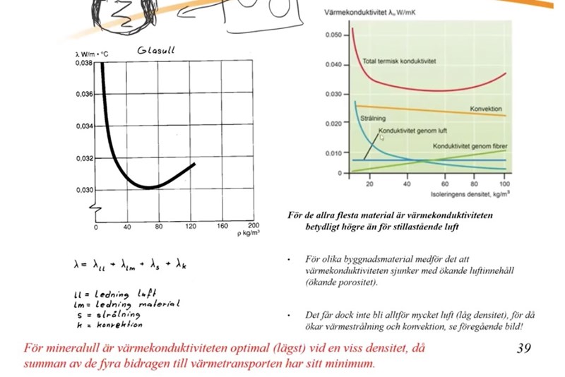 Den röda kurvan i den högra grafen och kurvan i den vänstra grafen visar samma sak men det finns mer information i den högra. Värmeledning består av konvektion, strålning och ledning (konduktion). I ett isolermaterial så har man skapat ett poröst material som innehåller fibrer (av t ex glas eller sten/mineral) och luft. Beroende på hur hårt man packar isolermaterialet så får det olika egenskaper när det gäller isoleringsförmågan och det är det du ser i bilderna. Löst packat (låg densitet) är isolerförmågan sämre och hårt packat (hög densitet) så minskar isolerförmågan också. Nånstans däremellan är den optimal som du ser i kurvan (isolerförmåga är inverterad ledningsförmåga därför är kurvan min när isolerförmågan är som bäst.