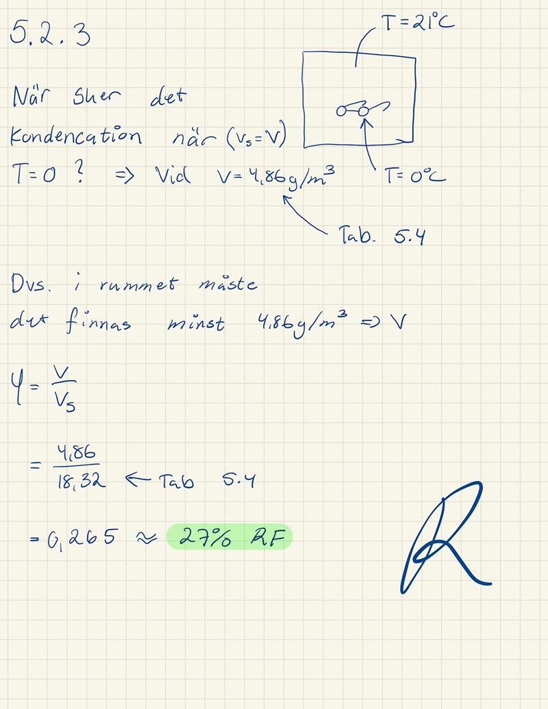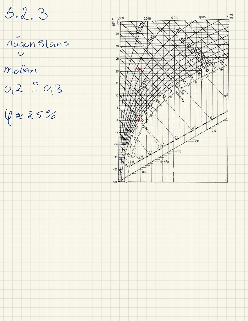 CurtJ skrev:Jag vet inte heller var siffrorna kommer men ni kanske har någon tabell att ta värdena ifrån. Jag skulle använda ett mollierdiagram där du kan pricka in tillståndet (kalla det 1) på glasögonen där kondensationen sker. Där är t=0 och phi=1.0. Sen går man rakt uppåt (inget fukttillskott, x=konstant) till temperaturen t=21 (tillstånd 2) och kan läsa av den relativa fuktigheten. Obs att processen i verkligheten går åt andra hållet från 2 till 1.