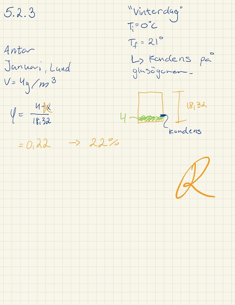 Jag vet inte heller var siffrorna kommer men ni kanske har någon tabell att ta värdena ifrån. Jag skulle använda ett mollierdiagram där du kan pricka in tillståndet (kalla det 1) på glasögonen där kondensationen sker. Där är t=0 och phi=1.0. Sen går man rakt uppåt (inget fukttillskott, x=konstant) till temperaturen t=21 (tillstånd 2) och kan läsa av den relativa fuktigheten. Obs att processen i verkligheten går åt andra hållet från 2 till 1.