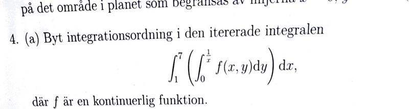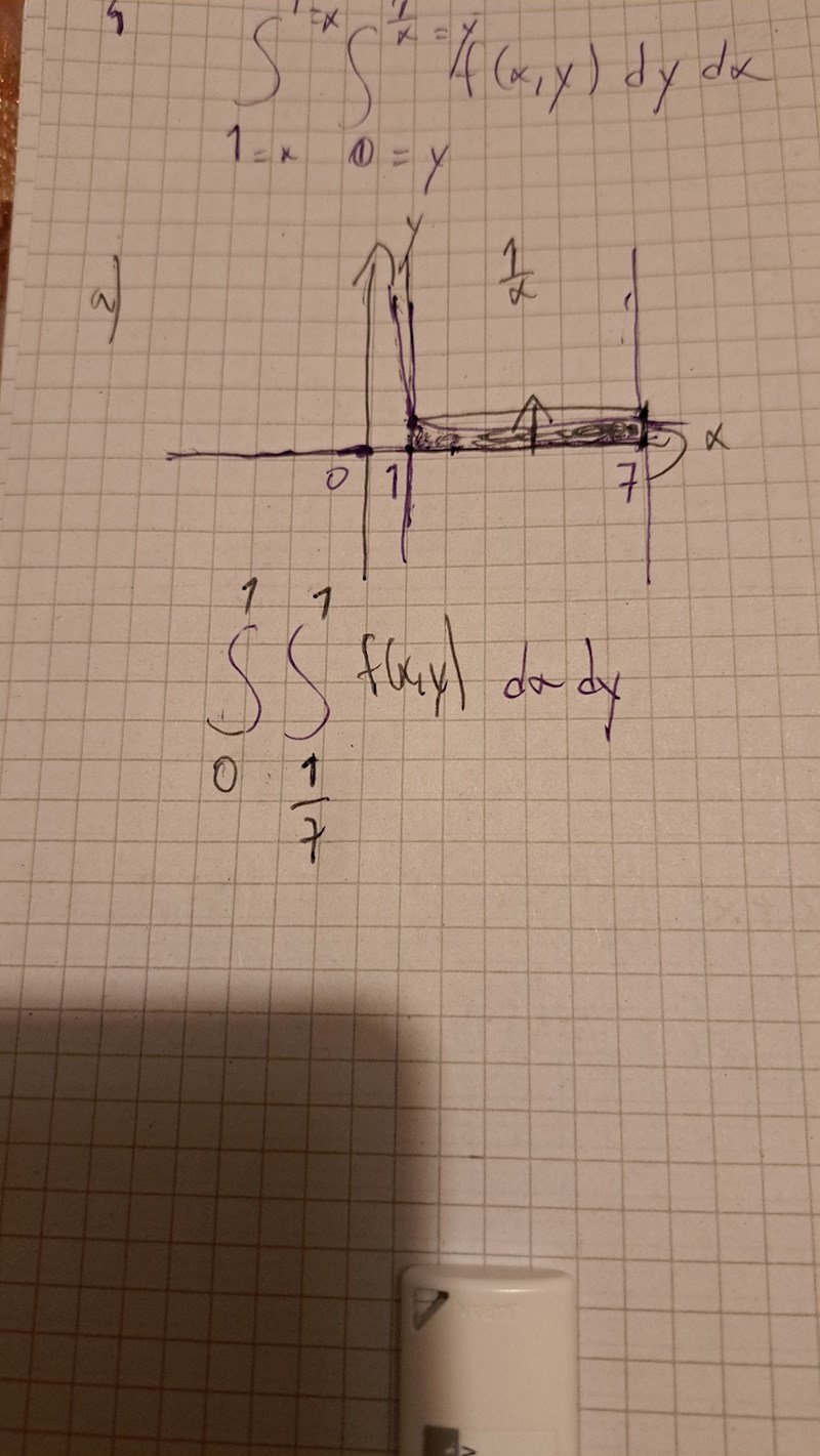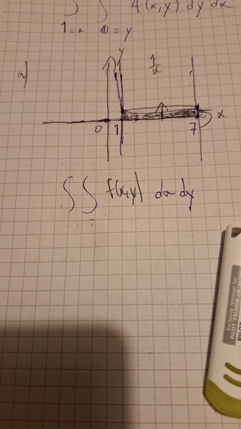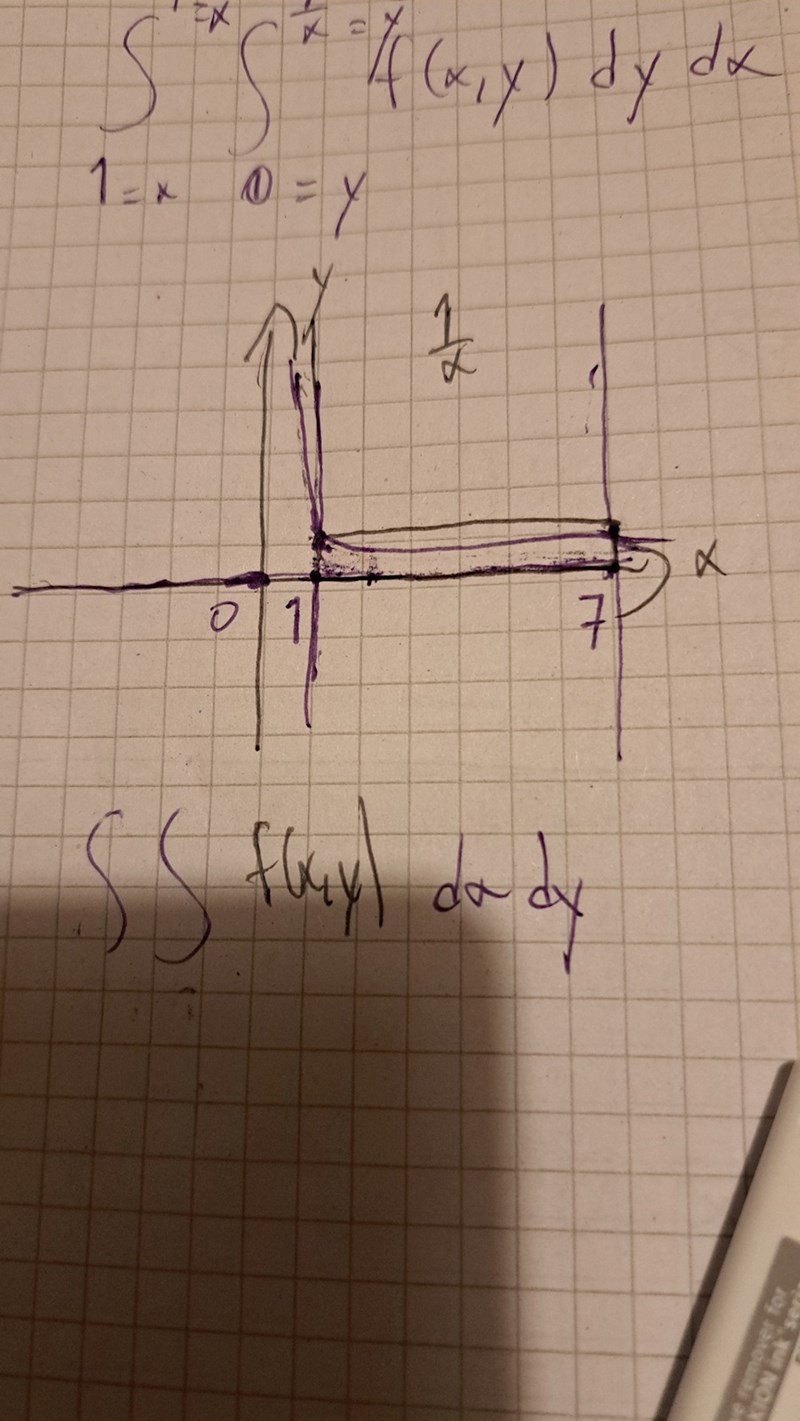 Calle_K skrev:Du skulle kunna dela upp området för dubbelintegralen, en med rektangulära området där 1<x<7 och 0<y<1/7. Det andra området är det skuggade området exklusive denna rektangel.