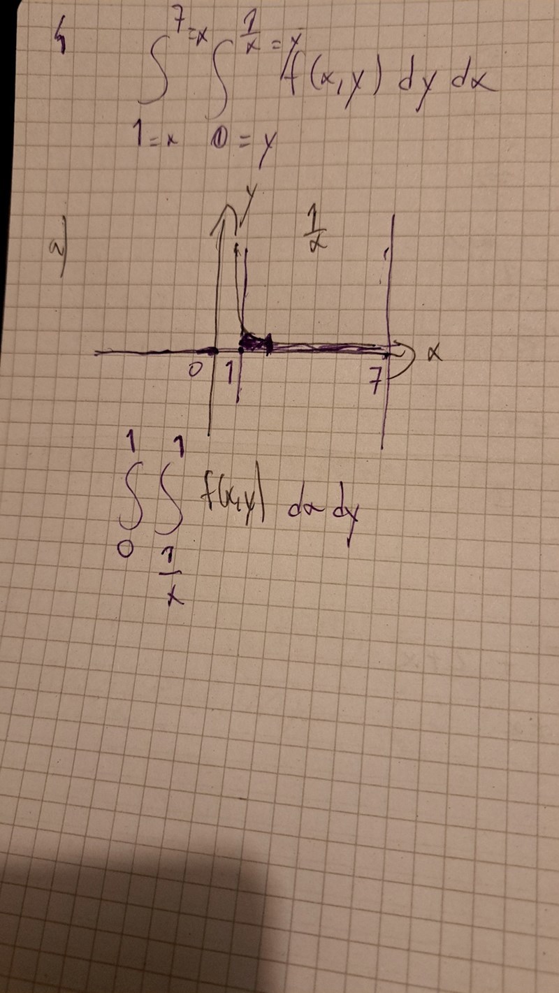 Du skulle kunna dela upp området för dubbelintegralen, en med rektangulära området där 1<x<7 och 0<y<1/7. Det andra området är det skuggade området exklusive denna rektangel.