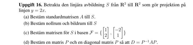 jag har fastnat på uppgift c) i den här uppgiften, standardmatrisen har jag fått till den i bilden. Så man ska väl skriva A i basen F? Är inte helt säker på hur man gör det. Tack för hjälp!