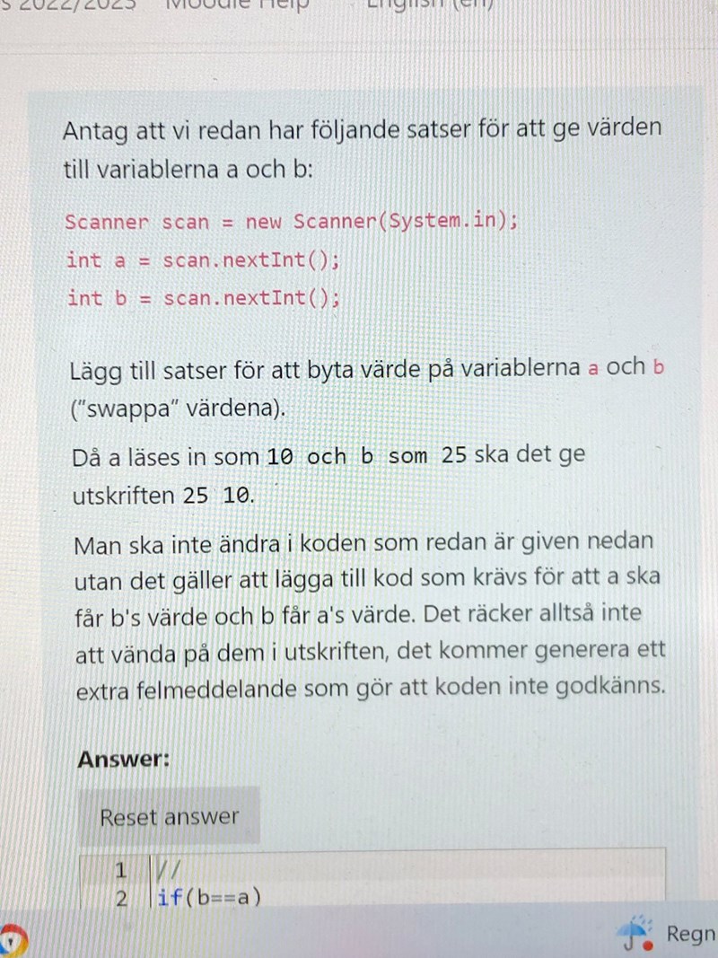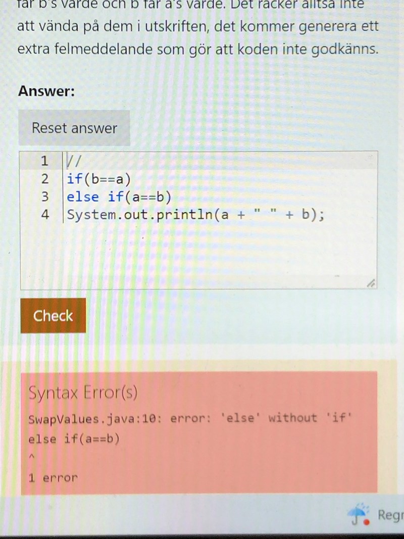 Hej, jag ska lägga till satser för att byta värde på variablerna a och b så att om a läses in som 10 och b som 25 ska det ge utskriften 25 10. Jag gör dock något fel (det står att jag har skrivit ”else” utan ”if” men det har jag med). Ser någon vad jag gör fel?