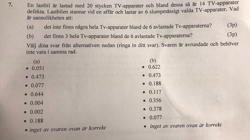 Vi söker på hur många sätt vi kan välja 6 stycken av potten med de defekta samt 0 från potten med hela apparater alltså: