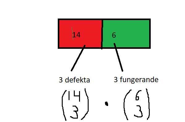 Vi tänker igen att vi har två potter. En pott med defekta som innehåller 14 stycken, en pott med hela som innehåller 6 stycken. På hur många sätt kan vi välja 3 som ska vara hela från potten med totalt 6 hela och då samtidigt välja 3 stycken defekta från potten med de 16 defekta apparaterna. se bild