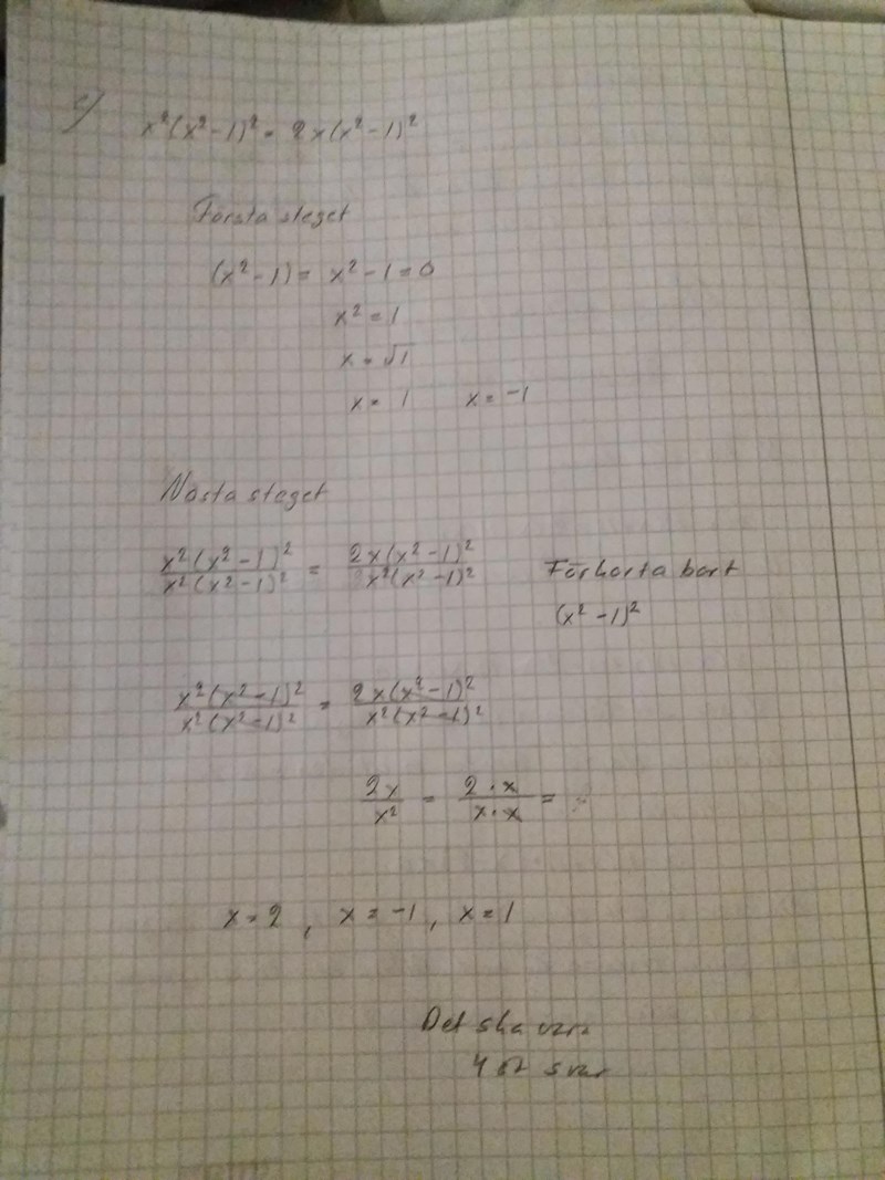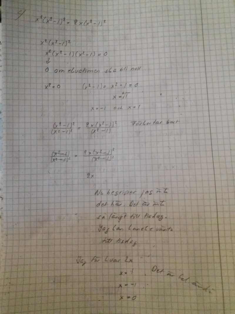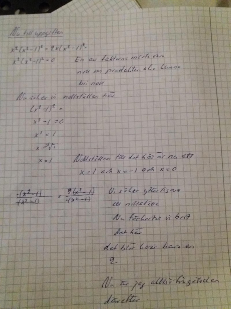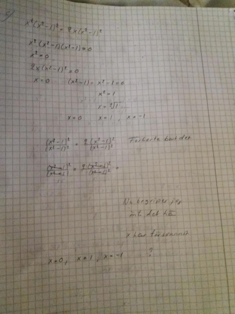 Exakt vad menar du ska bli noll? Jag frågar eftersom du strax efteråt räknar på en faktor (x^2-1) som finns i bägge leden OCH på en faktor x^2 som bara finns i vänsterledet.