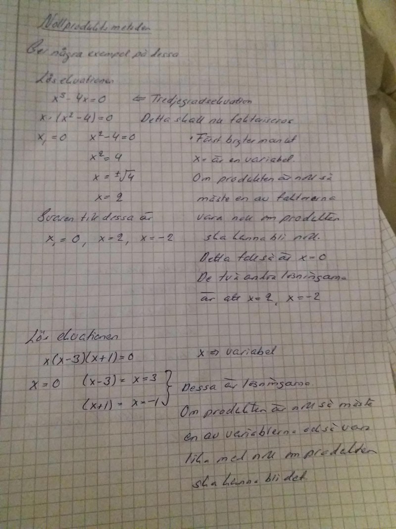 Det är konstigt att du tycker att nollproduktmetoden är ny för dig. I alla matteböcker jag kan komma ihåg börjar man kapitlet om andragradsekvationer med att lösa uppgiften av typen och därefter uppgifter av typen och då förklarar man nollproduktmetoden - att om "nånting" gånger "nånting annat" är lika med noll, så måste antingen "nånting" eller "nånting annat" vara lika med 0. Sedan utvecklar men det vidare och kommer så småningom fram till kvadratkomplettering och därefter pq-formeln (och sedan brukar många glömma de där enklare fallen i början).