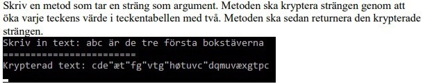 Ta emot inputen och spara undan den i en variabel, sedan kan du konvertera varje char till dess ASCII värde och addera det med ett lämpligt värde. Nu kan du bara konvertera tillbaka och skriva ut strängen på nytt.