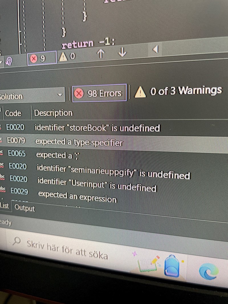Aha ja new book löste sig. Men det står fortfarande att storeBook är identifierad. Sätter jag mellanslag där så blir ordet ”store” identifierad